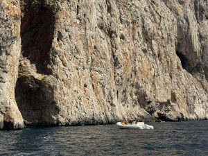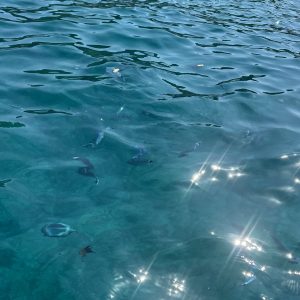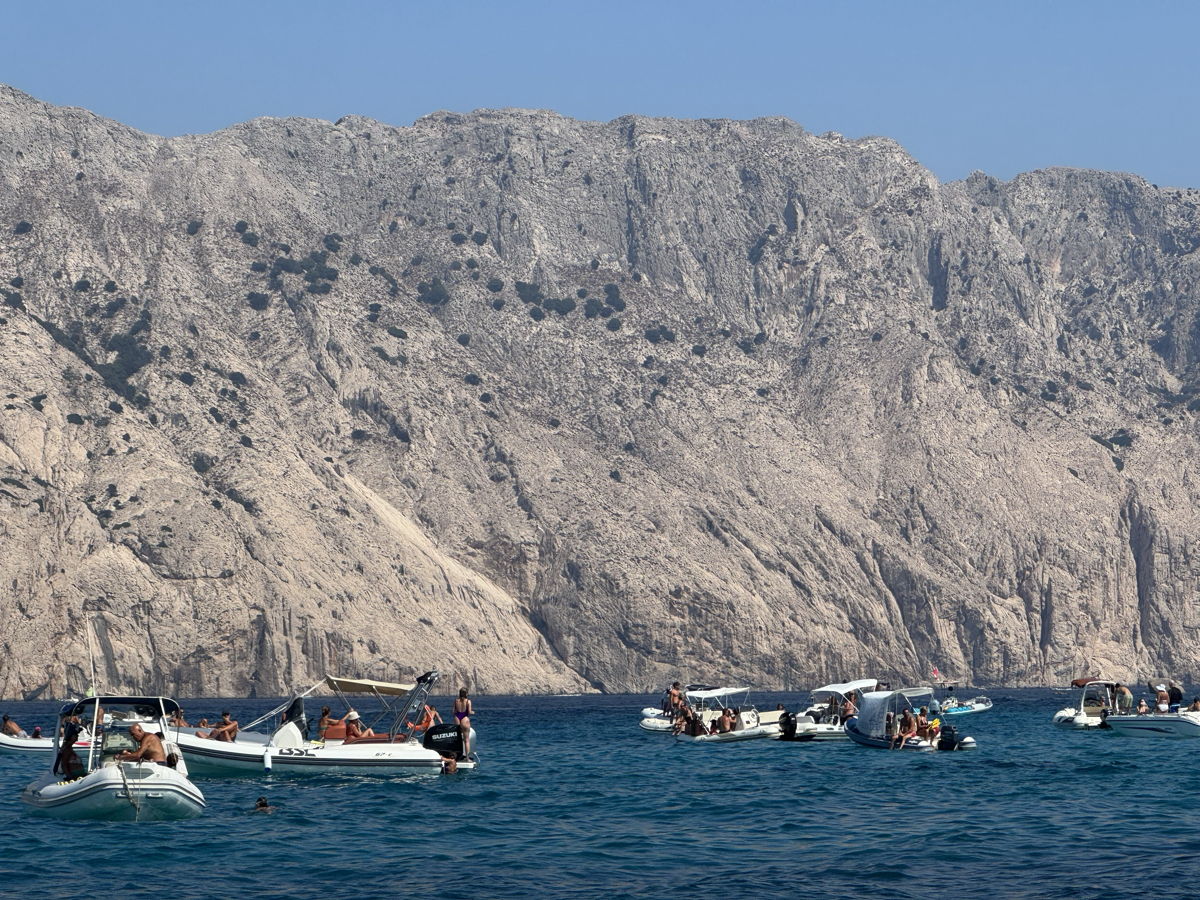 Nach der Wrackbesichtigung sind wir dann zu einem sehr schönen Schnorchelgebiet ganz in der Nähe gefahren. Das Wasser türkis, wie in der Karibik. Allerdings mit sehr vielen anderen Schlauchbooten und Schnorchlern, da Wrack und diese Küste sehr gut von den umliegenden Häfen zur erreichen sind. Das macht aber nichts, da das Gebiet groß ist und es genügend Platz zum Schnorcheln gibt. Also ab ins Wasser und Fische anschauen. Nur das gleichmäßige Geräusch unseres Atems durch den Schnorchel und das Knistern des Mittelmeeres -und der Aussenborder- waren zu hören.